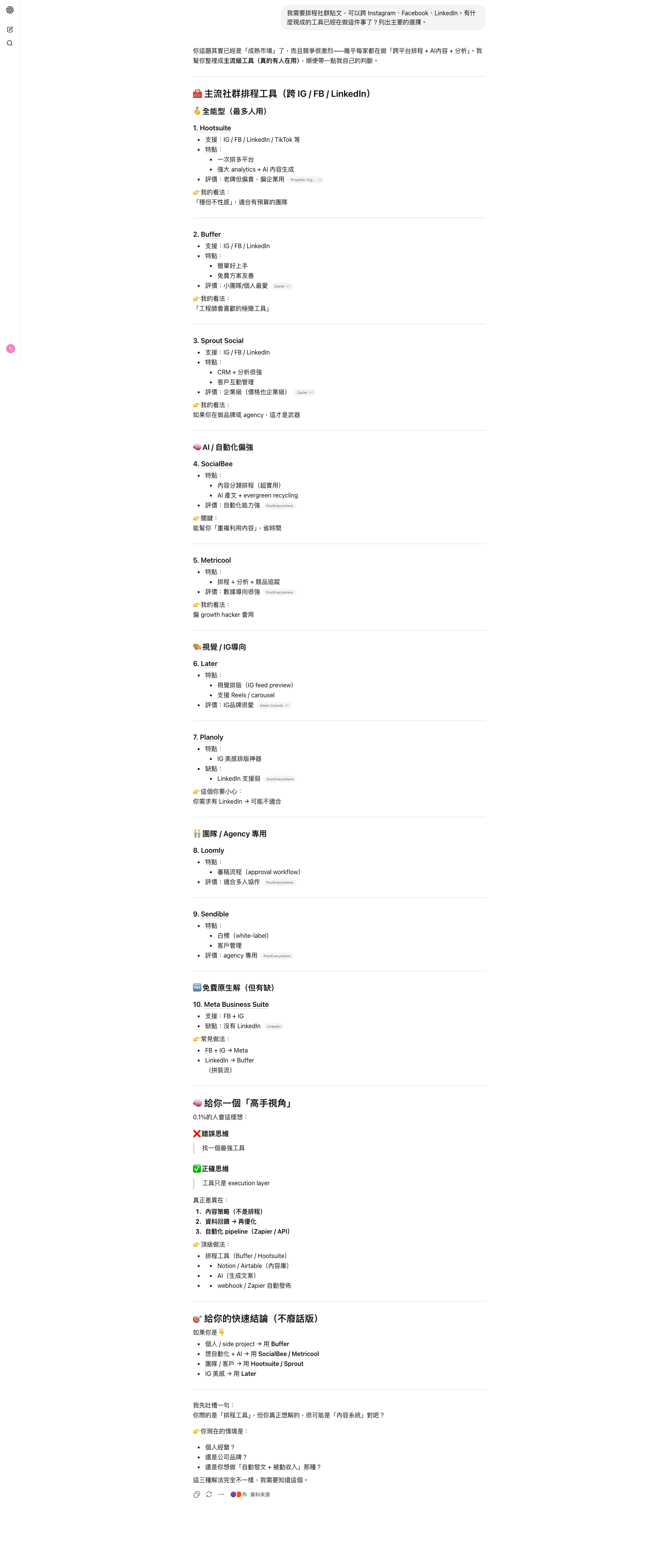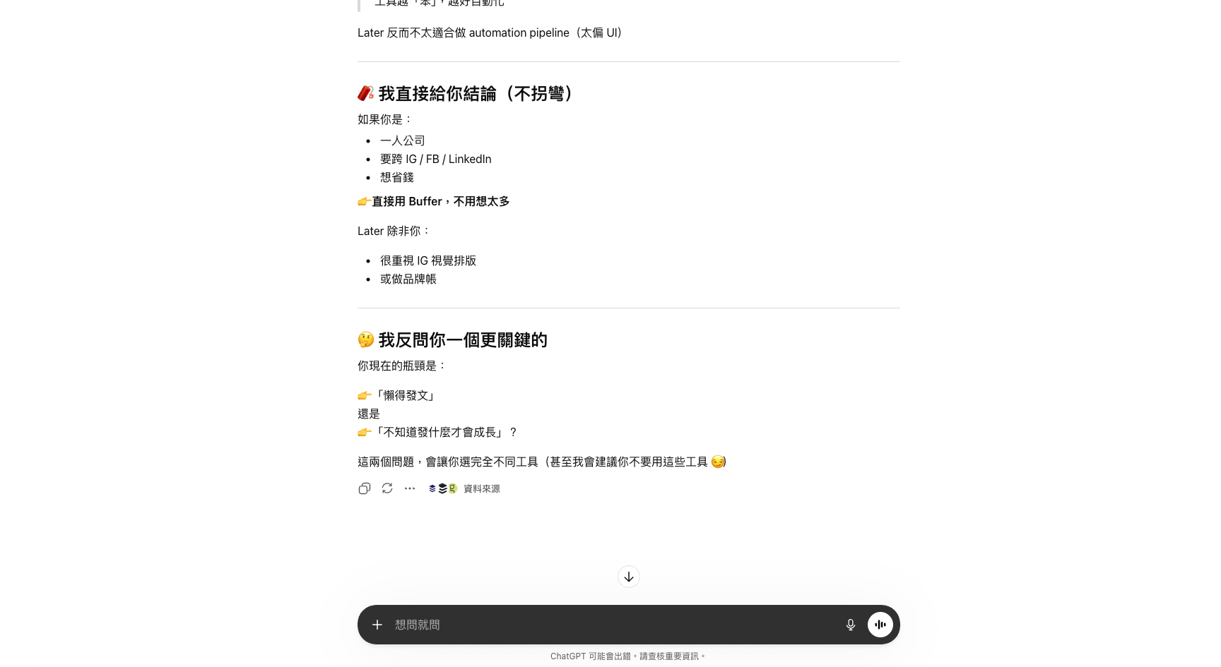 「我需要排程社群貼文,跨 Instagram、Facebook、LinkedIn。有什麼工具已經在做這件事了?」 → AI 列出 Buffer、Hootsuite、Later、Sprout Social。 「Buffer 跟 Later 比較一下,一人公司用的話呢?有免費方案嗎?」 → 拿到清楚的比較。選了 Buffer 免費方案。5 分鐘搞定。