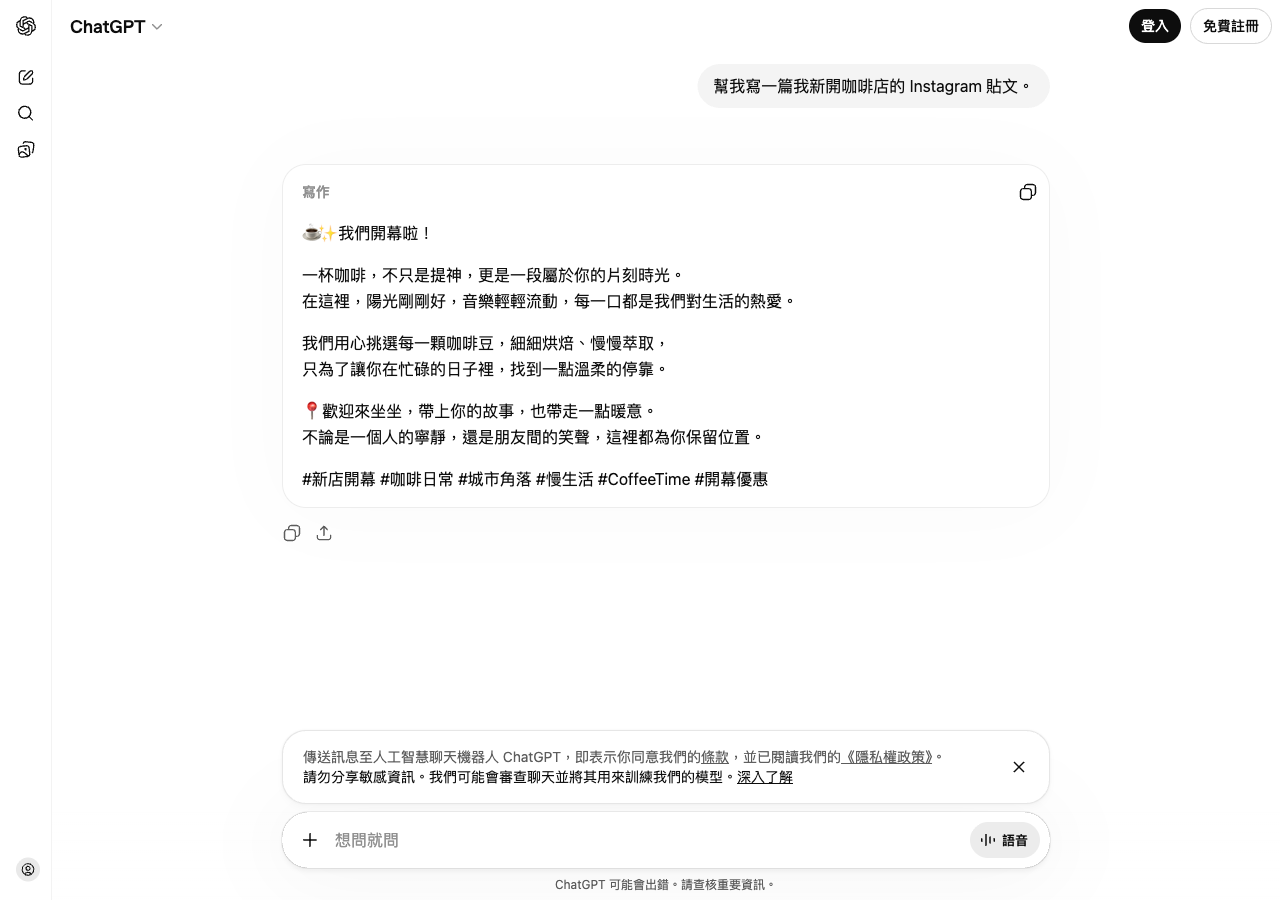 我在 ChatGPT 上用同樣的題目 —「幫我寫一篇我新開咖啡店的 Instagram 貼文」— 實測了兩種模式,給你看一下對比。