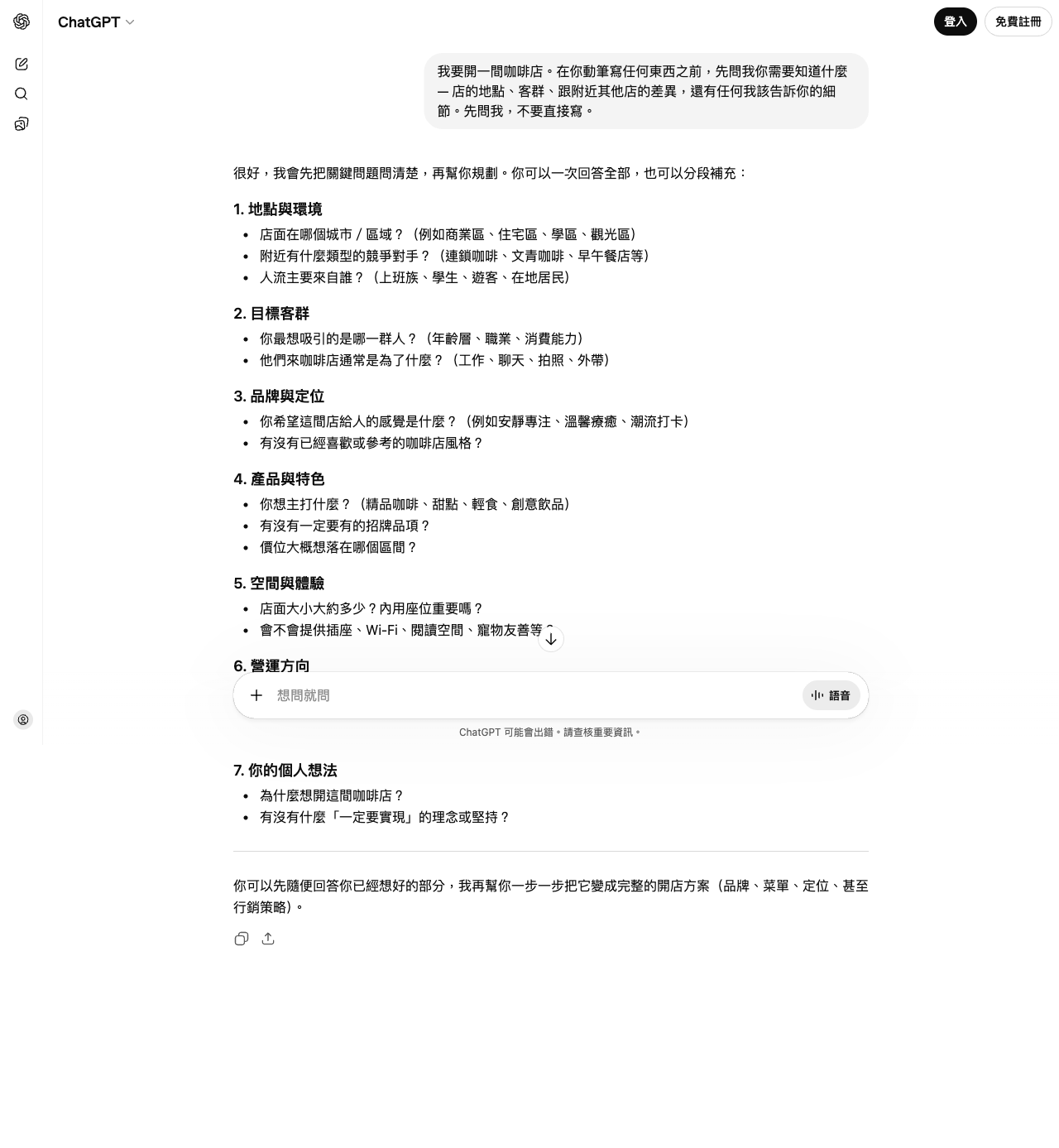 - ✅「我要開一間咖啡店。在你動筆之前,先問我你需要知道什麼 — 店的地點、客群、跟附近其他店的差異是什麼?」
