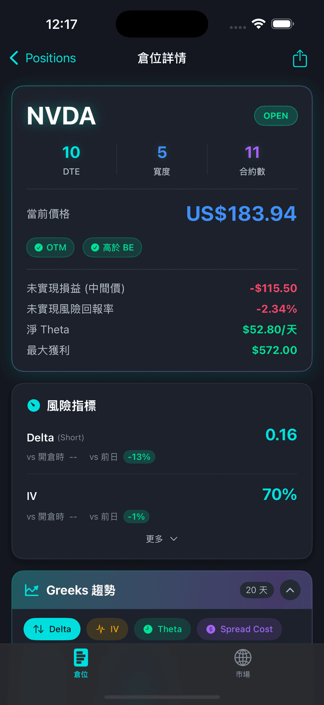 Delta、Gamma、Theta、Vega 完整呈現,比較開倉與現在數值。Pro 版更有 Delta / IV / Theta 歷史趨勢圖,追蹤倉位演變。